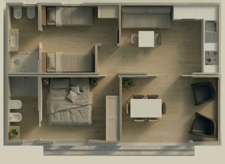 Dreizimmerwohnung mit 48,5 qm (38 qm im Innenbereich und 10,5 qm Veranda) für 4+1 Personen.