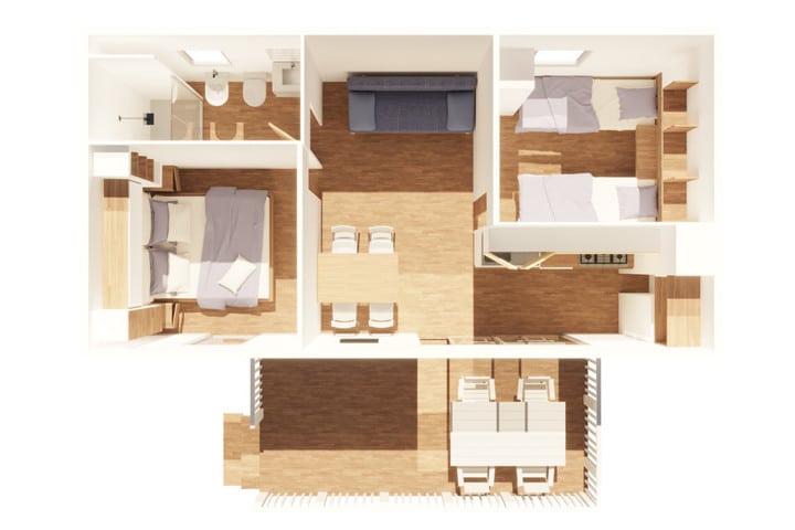 Trilocale di 41 mq (30,50 interni e 10,50 di veranda) può ospitare 5 persone.