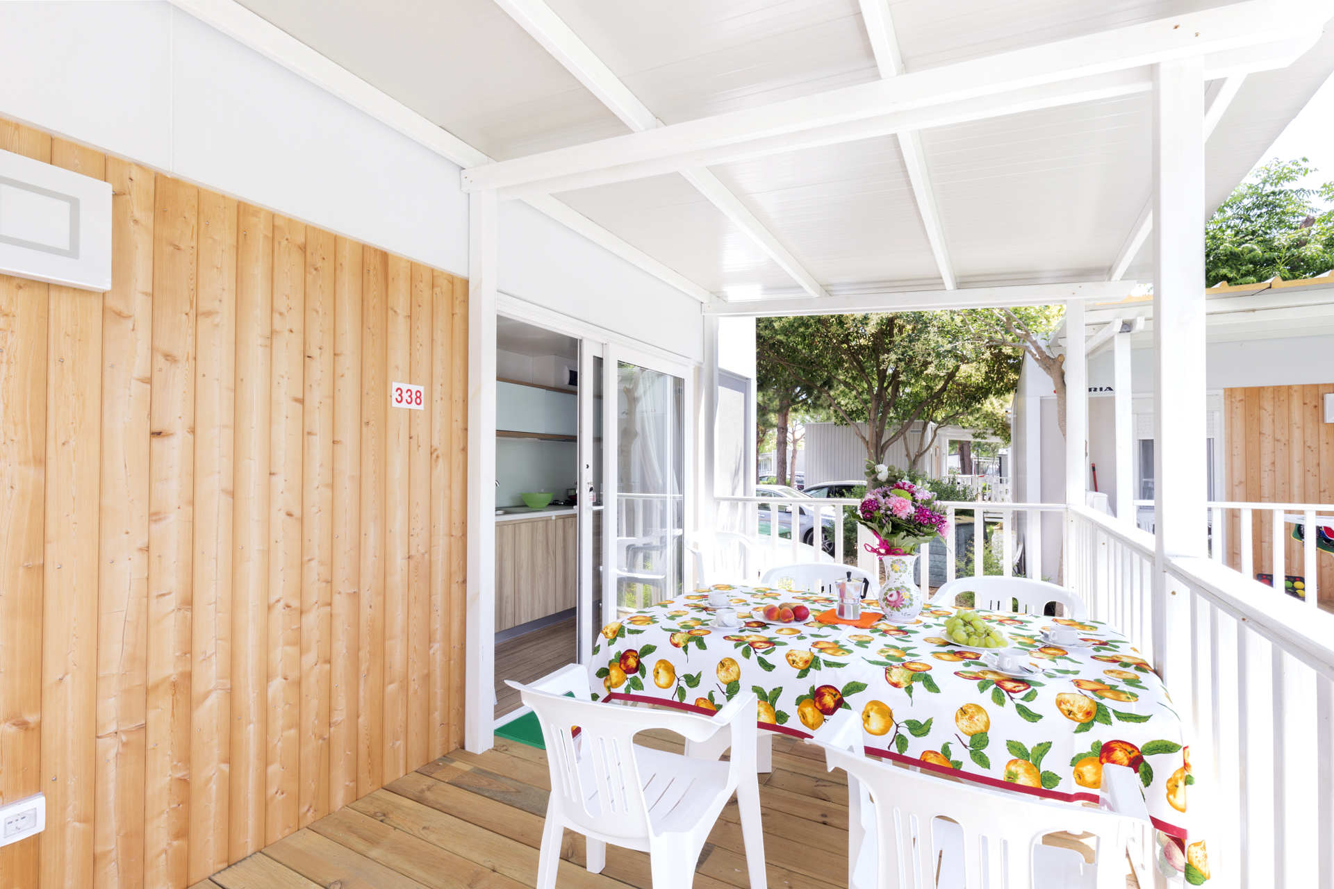 La veranda esterna di 10,5 mq è arredata con tavolo, sedie e due sdraio.