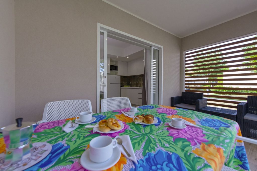Gli alloggi sono composti da soggiorno/cucina, dinette con letto estraibile (130 X 190 cm), angolo cottura con piano a 4 fuochi, cappa aspirante, frigorifero, lavello, lavastoviglie, microonde, pentole e stoviglie. Una camera matrimoniale ed una camera con due letti bassi. Le due camere hanno accesso diretto ai due bagni con lavabo, cabina doccia, wc, asciugacapelli e bidet. Doccia con cromoterapia nel bagno della camera padronale. Veranda arredata con tavolo e sei sedie, due poltroncine.